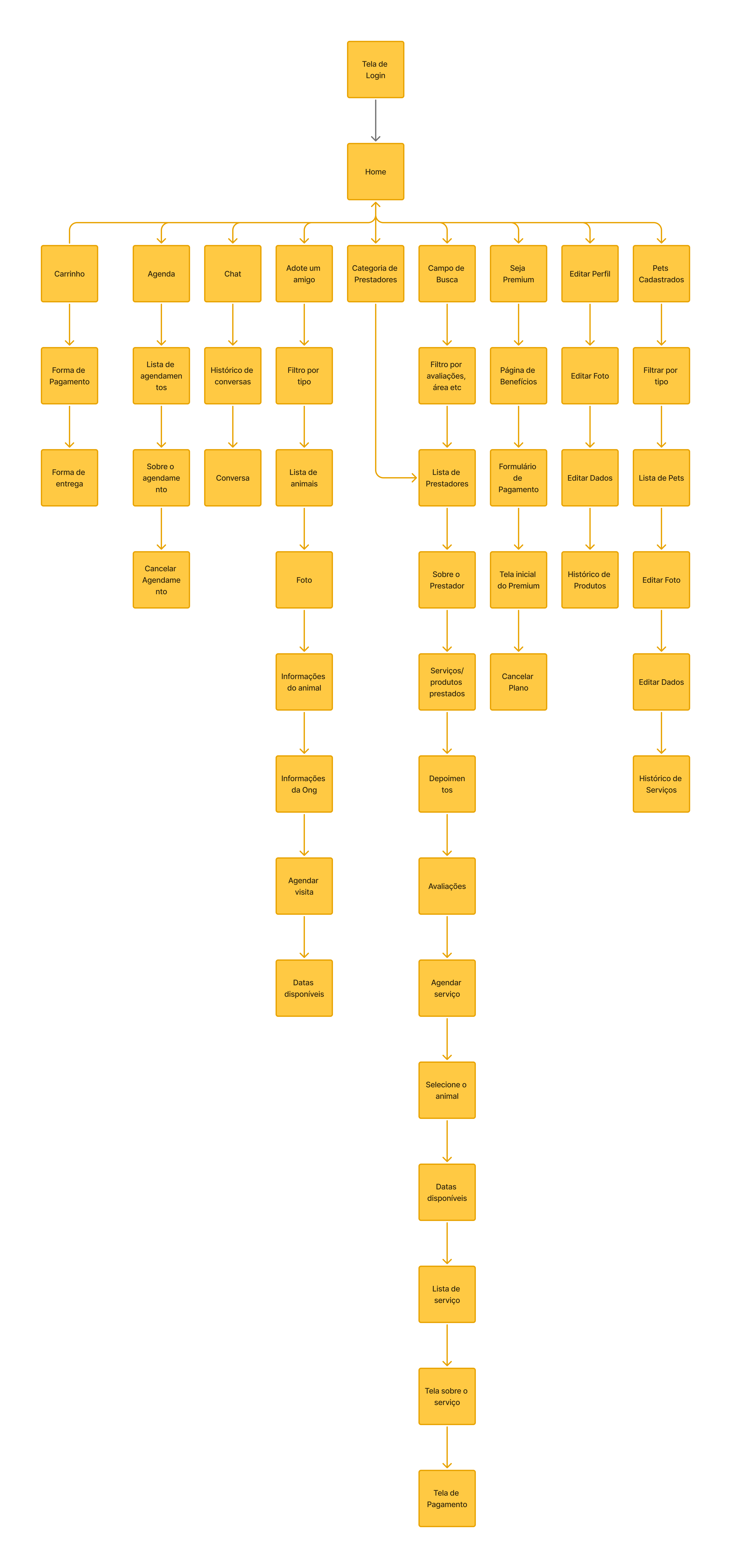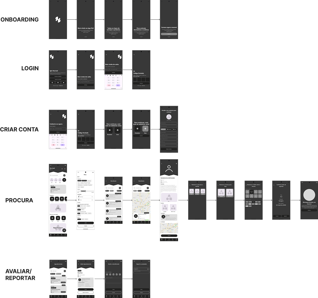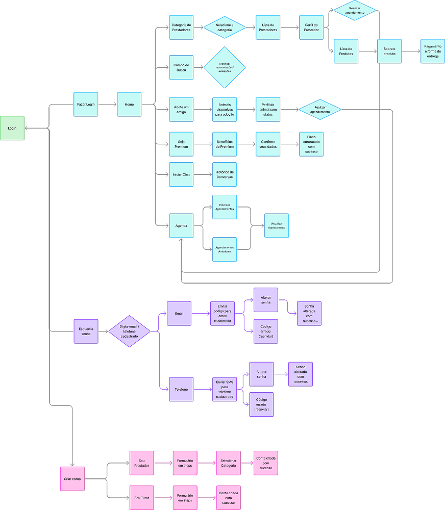O mapa foi transformado em fluxo do usuário com detalhes para facilitar a visualização dos fluxos e momentos de decisão.
