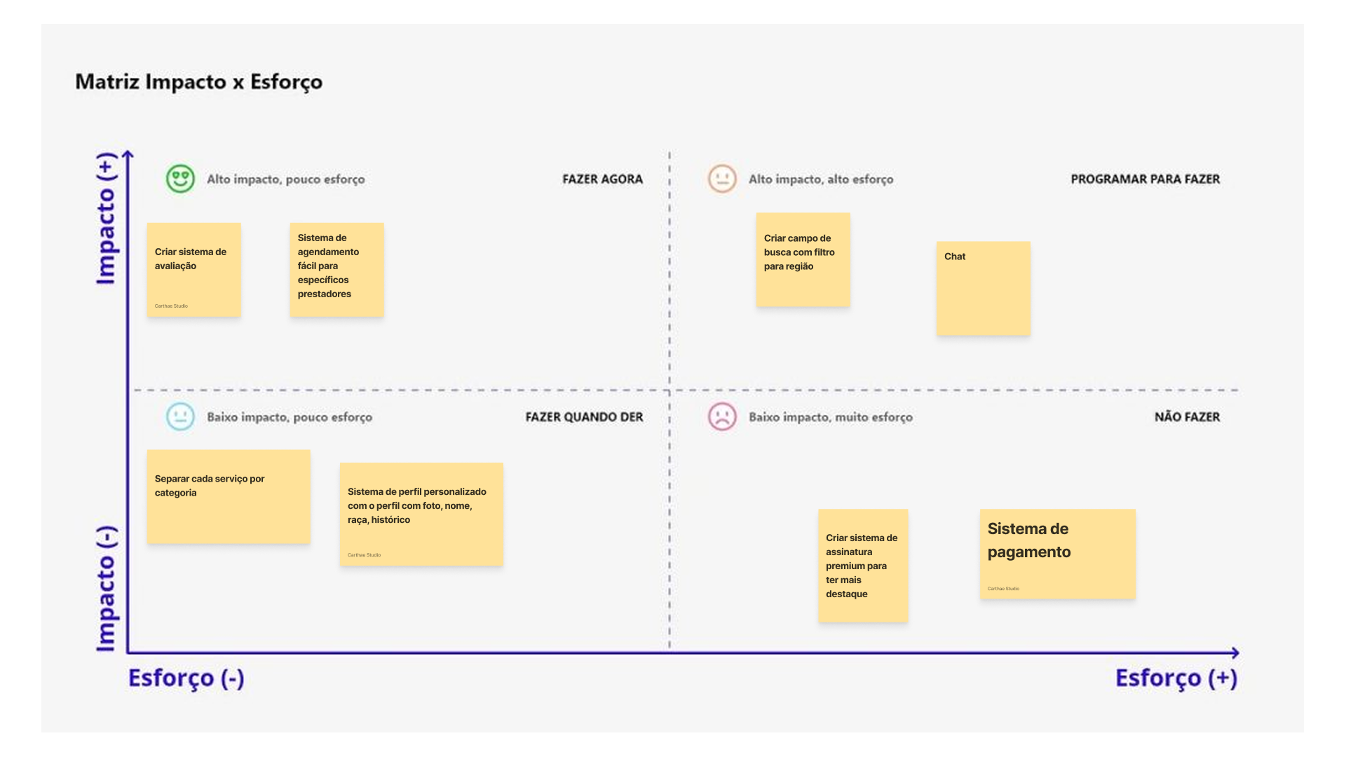 Enfim, cheguei na criação da Matriz Impacto X Esforço para chegar as melhores oportunidades para o MVP, que vão gerar o maior valor para o usuário e o negócio menos esforço técnico.